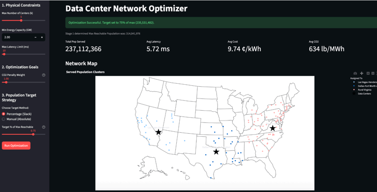 The Incentive: The massive expansion of cloud and AI is currently colliding with significant energy capacity constraints. We aimed to identify specific metropolitan areas that provide the optimal balance between serving the maximum population with the lowest latency while strictly adhering to budget constraints and aggressive decarbonization goals.