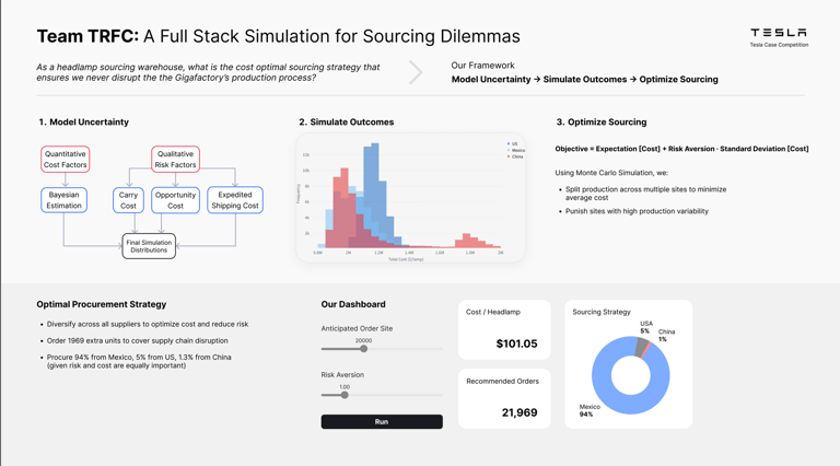 The Model: Utilized Monte Carlo Simulation, Bayesian Priors, and Linear Programming to model a multi-echelon supply chain. The model balanced procurement costs, lead times, and risk-adjusted constraints for critical light components.