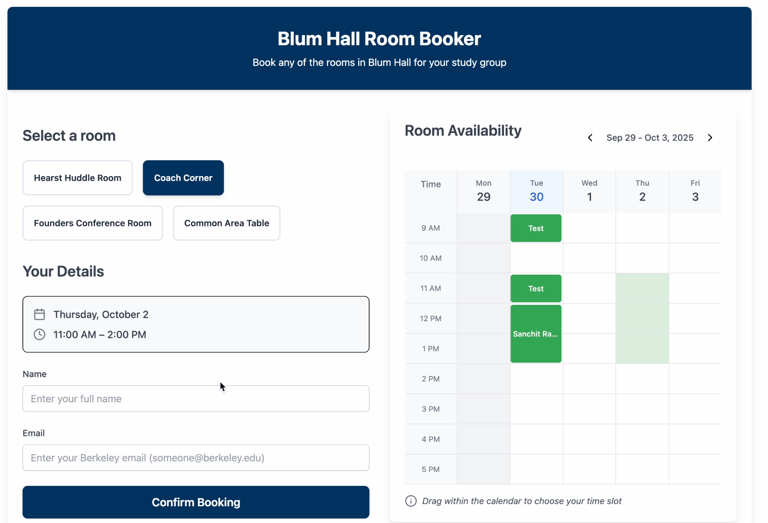 The Impact: Successfully deployed a Vercel tool that eliminated manual scheduling friction and eliminated booking conflicts. The platform provides a transparent user experience for the student body while optimizing the utilization of physical program assets